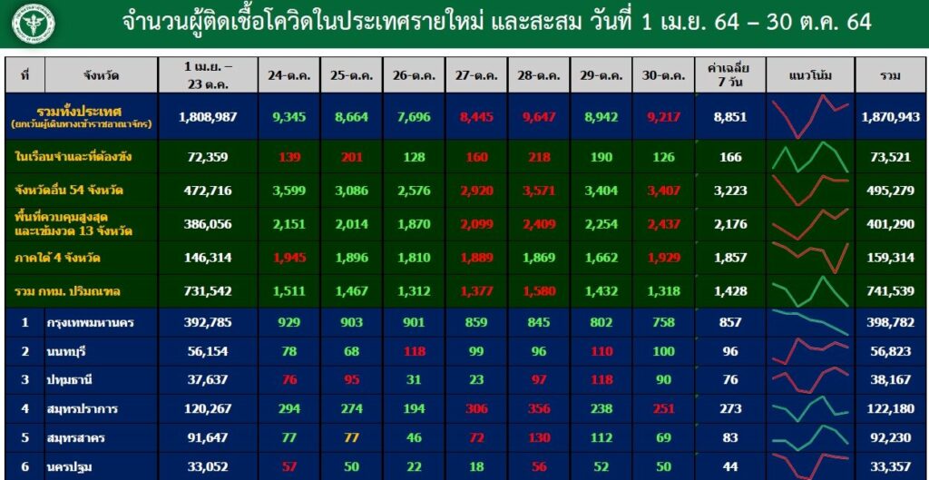 ส่วนผู้ติดเชื้อที่เดินทางมาจากต่างประเทศจำนวน 7 รายนั้น แบ่งเป็นเดินทางมาจากประเทศอุซเบกิสถาน สาธารณรัฐสิงคโปร์ สาธารณรัฐเกาหลี และสาธารณรัฐตุรกี ประเทศละ 1 ราย และเมียนมา 3 ราย ส่วนจังหวัดที่มีจำนวนผู้ติดเชื้อโควิด-19 ในประเทศรายใหม่และสะสม ตั้งแต่วันที่ 1 เมษายน-30 ตุลาคม แบ่งเป็น รวมทั้งประเทศ 1,808,987 ราย ในเรือนจำและที่ต้องขัง 72,359 ราย จังหวัดอื่น 54 จังหวัด 472,716 ราย พื้นที่ควบคุมสูงสุดและเข้มงวด 13 จังหวัด 386,056 ราย ภาคใต้ 4 จังหวัด 146,314 ราย กรุงเทพมหานครและปริมณฑล รวม 731,542 ราย โดยแบ่งเป็น กรุงเทพมหานคร 392,785 ราย นนทบุรี 56,154 ราย ปทุมธานี 37,637 ราย สมุทรปราการ 120,267 ราย สมุทรสาคร 91,647 ราย และนครปฐม 33,052 ราย