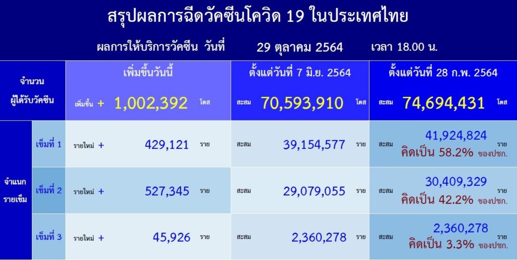 ขณะที่จำนวนผู้รับวัคซีนสะสมตั้งแต่วันที่ 28 กุมภาพันธ์-15 ตุลาคม รวม 74,694,431 โดส ใน 77 จังหวัด จำนวนผู้ได้รับวัคซีนเข็มที่ 1 สะสม 41,924,824 ราย เข็มที่ 2 สะสม 30,409,329 ราย และเข็มที่ 3 สะสม 2,369,278 ราย