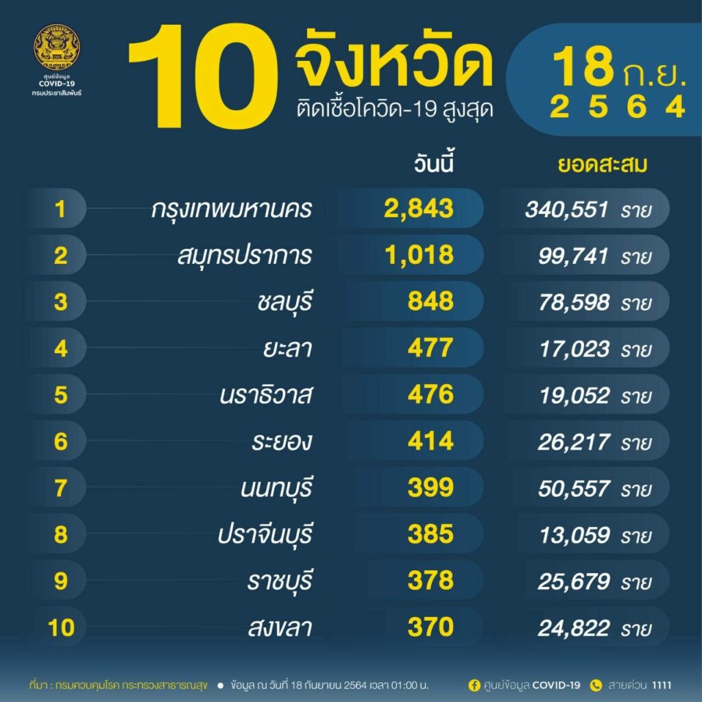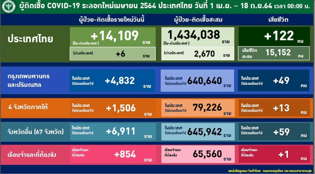 เมื่อวันที่ 18 กันยายน ผู้สื่อข่าวรายงานว่า ศูนย์บริหารสถานการณ์การแพร่ระบาดของโรคติดเชื้อไวรัส โคโรนา 2019 (โควิด-19) (ศบค.) รายงานสถานการณ์การแพร่ระบาดของโควิด-19 ในประเทศไทยว่า ผู้ป่วยรายใหม่วันนี้ 14,109 ราย ติดเชื้อในประเทศ 13,249 ราย ติดเชื้อจากต่างประเทศ 6 ราย และจากเรือนจำ/ที่ต้องขัง 854 ราย ผู้ป่วยยืนยันสะสม 1,434,038 ราย ส่วนผู้ป่วยยืนยันสะสมตั้งแต่ปี 2563 คือ 1,462,901 ราย