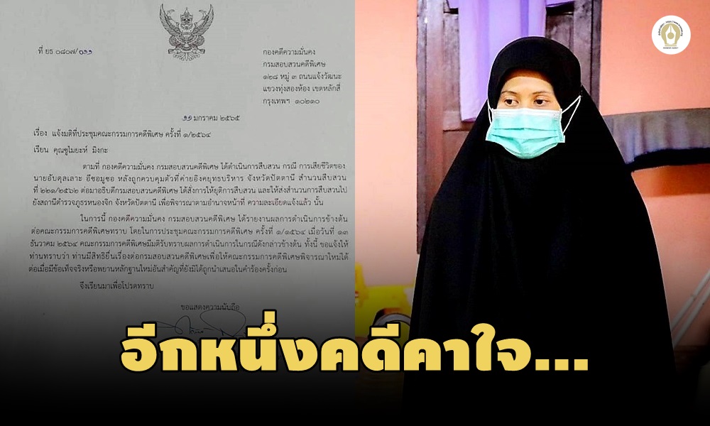 เอกสารชี้แจงที่ส่งถึงภรรยานายอับดุลเลาะ ระบุตอนหนึ่งว่า “ในการนี้ กองคดีความมั่นคง กรมสอบสวนคดีพิเศษ ได้รายงานผลการดำเนินข้างต้นต่อคณะกรรมการคดีพิเศษครั้งที่ 1/2564 เมื่อวันที่13 ธ.ค.64 คณะกรรมการคดีพิเศษมีมติรับทราบผลการดำเนินการในกรณีดังกล่าวข้างต้น ทั้งนี้ขอแจ้งให้ท่านทราบว่า ท่านมีสิทธิ์ยื่นเรื่องต่อกรมสืบสวนคดีพิเศษ เพื่อให้คณะกรรมการคดีพิเศษพิจารณาใหม่ได้ต่อเมื่อมีข้อเท็จจริงหรือพยานหลักฐานใหม่อันสำคัญที่ยังไม่ได้ถูกนำเสนอในคำร้องครั้งก่อน”
