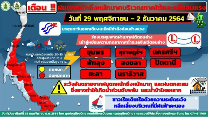 สำหรับประกาศศูนย์อุตุนิยมวิทยาภาคใต้ ฝั่งตะวันออก ฉบับที่ 3 (48/2564) รายงาน เรื่องฝนตกหนักถึงหนักมากบริเวณภาคใต้ฝั่งตะวันออก และคลื่นลมแรงบริเวณอ่าวไทย มีผลกระทบช่วงวันที่ 29 พฤศจิกายน – 2 ธันวาคม 2564