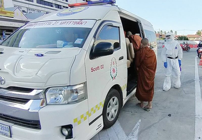 เจ้าหน้าที่กู้ภัยฮุก 31 นครราชสีมานำตัวพระที่ติดโควิด-19 ทั้งหมดไปกักตัวที่ศูนย์พักคอยวัดสัมปัตตะวนาราม ต.โคกกรวด อ.เมือง จ.นครราชสีมาแล้ว นอกจากนี้ทางศูนย์แพทย์ชุมชนเมือง 2 ร.พ.มหาราชนครราชสีมากำลังเร่งตรวจค้นหาด้วย ATK กับทางพระที่เดินทางมาสอบซึ่งเป็นกลุ่มเสี่ยงอีก 160 รูป
