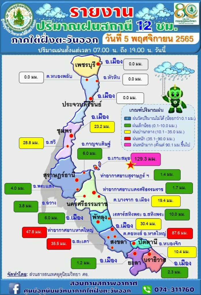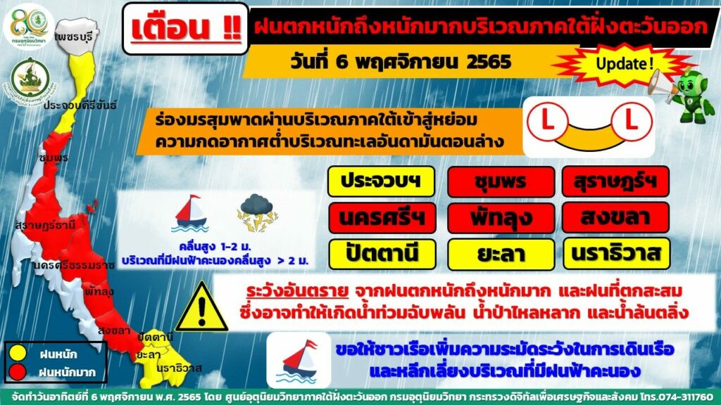 เมื่อเวลา 05.00 น. วันที่ 6 พฤศจิกายน รายงานข่าวแจ้งว่า ศูนย์อุตุนิยมวิทยาภาคใต้ฝั่งตะวันออก จ.สงขลา ออกประกาศฉบับที่ 6 (32/2565) เรื่อง ฝนตกหนักถึงหนักมากบริเวณภาคใต้ฝั่งตะวันออก มีผลกระทบวันที่ 6 พฤศจิกายน 65