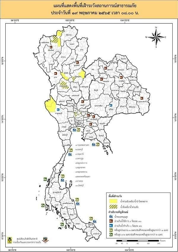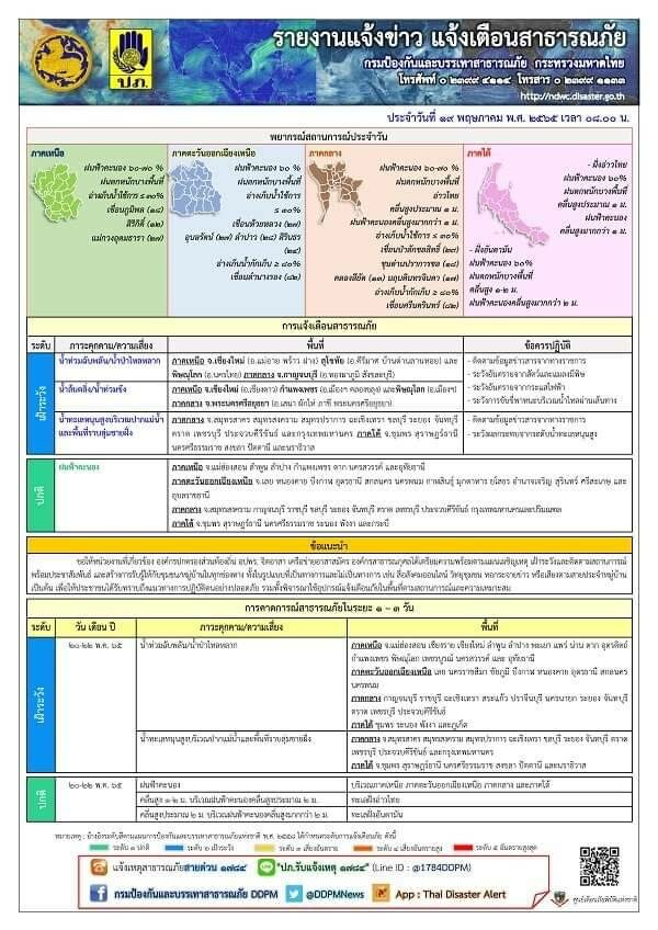 เมื่อเวลา 08.00 น. วันที่ 19 พฤษภาคม กรมป้องกันและบรรเทาสาธารณภัย เผยแพร่ข้อความระบุว่า รายงานข้อมูลคาดการณ์และแจ้งเตือนภัย