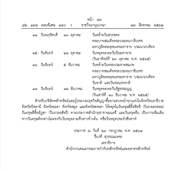 วันที่ 18 สิงหาคม 2564 ผู้สื่อข่าวรายงานว่า วานนี้ (17 ส.ค.) เว็บไซต์ราชกิจจานุเบกษา ได้เผยแพร่ประกาศสำนักงานคณะกรรมการกำกับหลักทรัพย์และตลาดหลักทรัพย์ เรื่อง วันหยุดทำการของบริษัทหลักทรัพย์และผู้ประกอบธุรกิจสัญญาซื้อขายล่วงหน้า ประจำปี พ.ศ. 2565 โดยตลอดปีมีวันหยุดรวมทั้งสิ้น 17 วัน