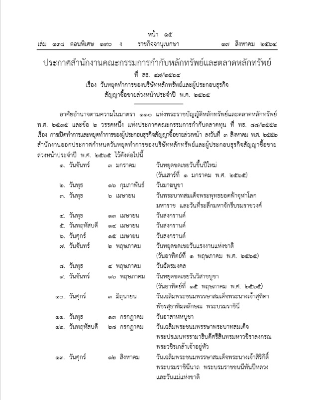 วันที่ 18 สิงหาคม 2564 ผู้สื่อข่าวรายงานว่า วานนี้ (17 ส.ค.) เว็บไซต์ราชกิจจานุเบกษา ได้เผยแพร่ประกาศสำนักงานคณะกรรมการกำกับหลักทรัพย์และตลาดหลักทรัพย์ เรื่อง วันหยุดทำการของบริษัทหลักทรัพย์และผู้ประกอบธุรกิจสัญญาซื้อขายล่วงหน้า ประจำปี พ.ศ. 2565 โดยตลอดปีมีวันหยุดรวมทั้งสิ้น 17 วัน