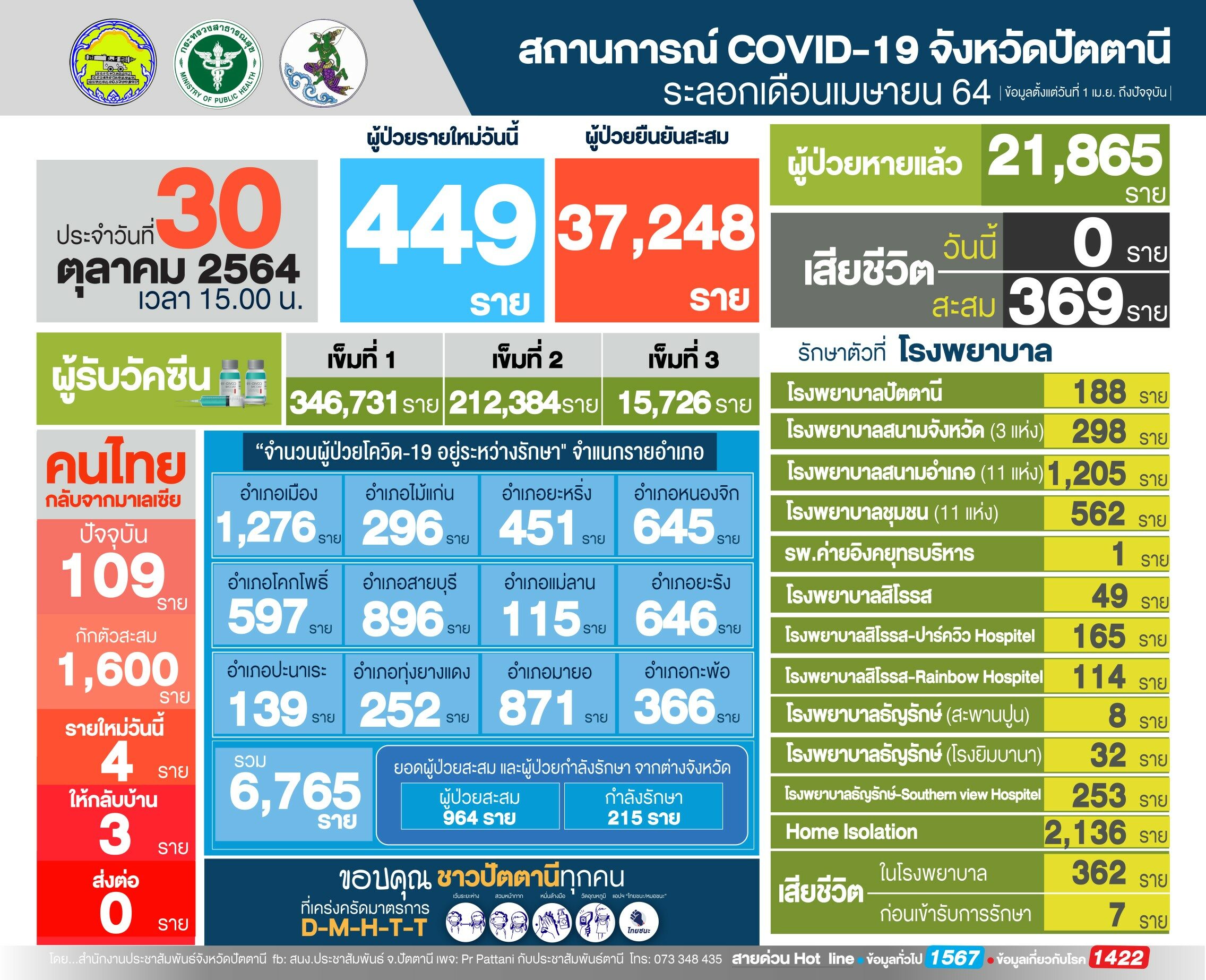 รายงานสถานการณ์ยอดสถิติรายวัน ปัจจุบันมียอดผู้ป่วยสะสม จำนวน 37,248 ราย รักษาหาย 21,865ราย และเสียชีวิตสะสม 369 ราย ใน ขณะที่มีผู้ป่วยภายในโรงพยาบาลสนาม ปัตตานีทั้งหมดล้นทั้ง 12 แห่ง 2,875 ราย พบผู้ป่วยใหม่ 449 ราย