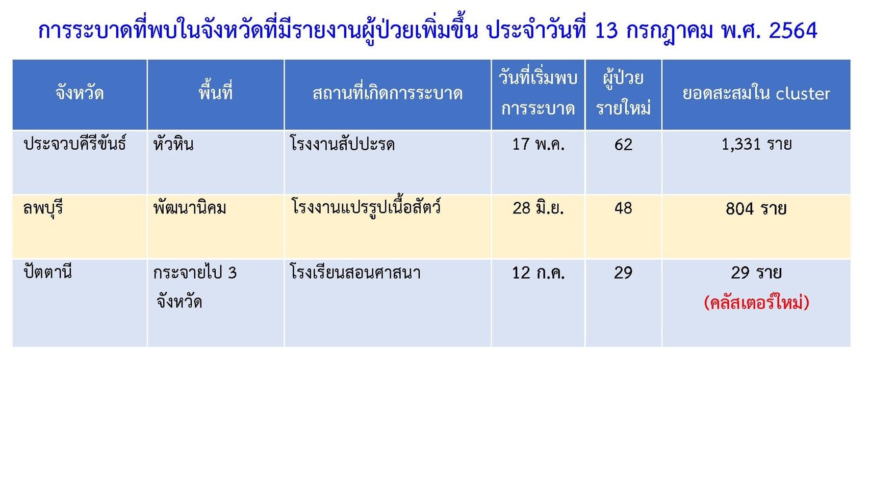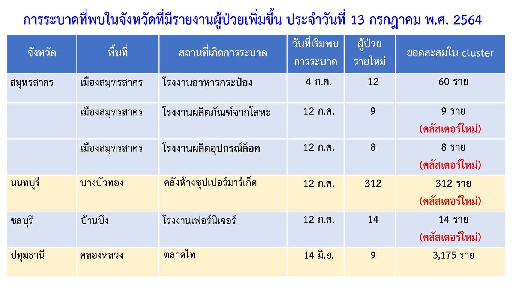 เมื่อวันที่ 13 กรกฎาคม 2564 ศูนย์บริหารสถานการณ์การแพร่ระบาดของโรคติดเชื้อไวรัสโคโรนา 2019 (โควิด-19) (ศบค.) รายงานว่า ในวันนี้พบการติดเชื้อของคลัสเตอร์ใหม่ใน 4 จังหวัด 5 คลัสเตอร์ ได้แก่ สมุทรสาคร โรงงานผลิตภัณฑ์จากโลหะ จำนวน 9 ราย โรงงานผลิตอุปกรณ์ล็อก จำนวน 8 ราย, นนทบุรี ที่บางบัวทอง คลังห้างซุปเปอร์มาร์เก็ต จำนวน 312 ราย, ชลบุรี ที่บ้านบึง โรงงานเฟอร์นิเจอร์ จำนวน 14 ราย, ปัตตานี โรงเรียนสอนศาสนา จำนวน 29 ราย และกระจายเชื้อไป 3 จังหวัด