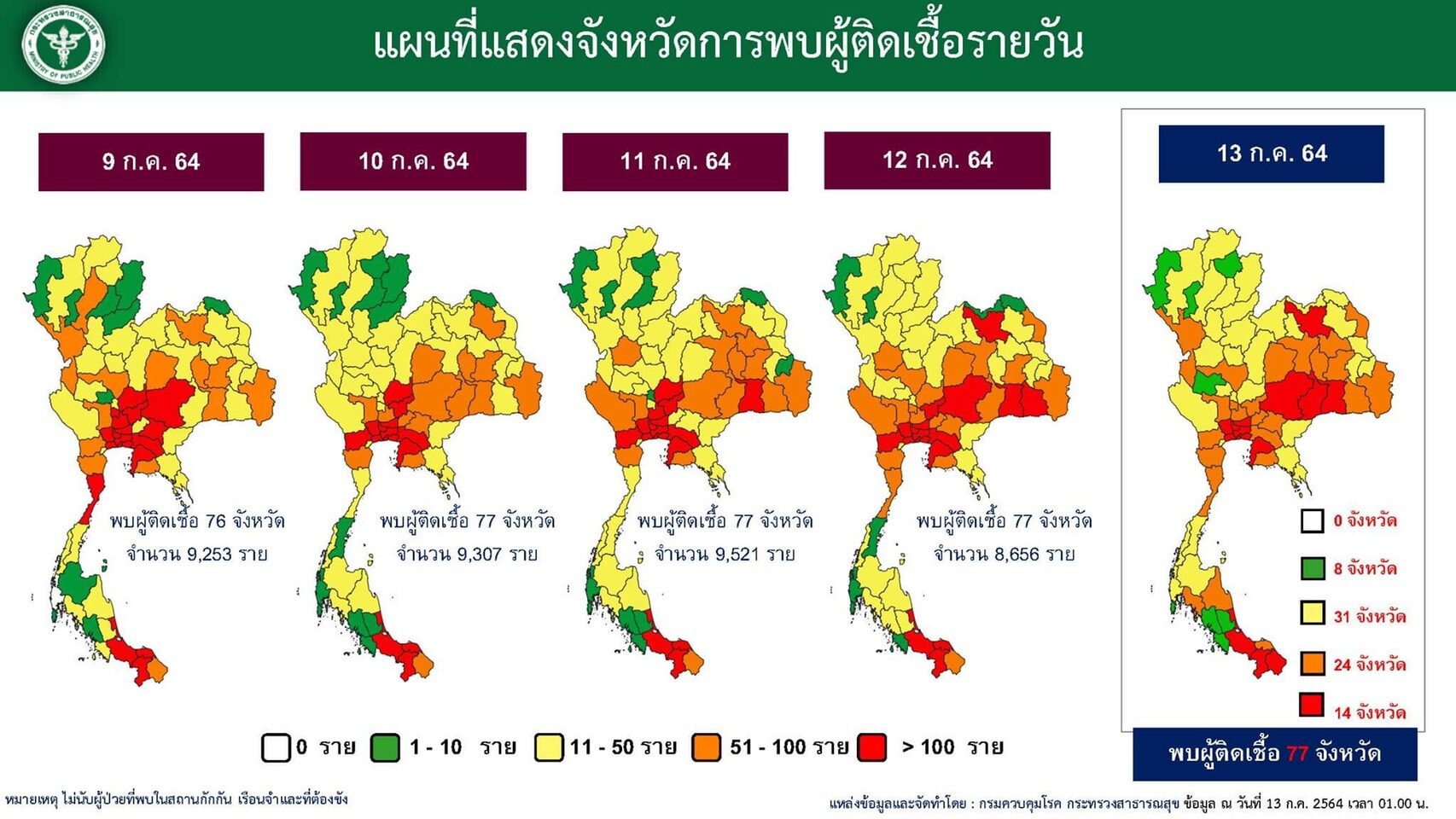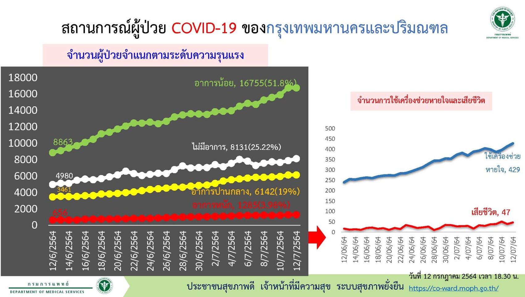 สำหรับสถานการณ์การติดเชื้อรายวันขณะนี้พบผู้ติดเชื้อทั้ง 77 จังหวัด โดยในพื้นที่กรุงเทพฯและปริมณฑล ณ วันที่ 12 กรกฎาคม มีจำนวนผู้ป่วยแยกตามระดับความรุนแรง พบมีอาการน้อย 16,755 ราย หรือ 51.8% ไม่มีอาการ 8,131 ราย หรือ 25.22% อาการปานกลาง 6,142 ราย หรือ 19% อาการหนัก 1,285 ราย หรือ 3.98% ใช้เครื่องช่วยหายใจ 429 ราย เสียชีวิต 47 ราย
