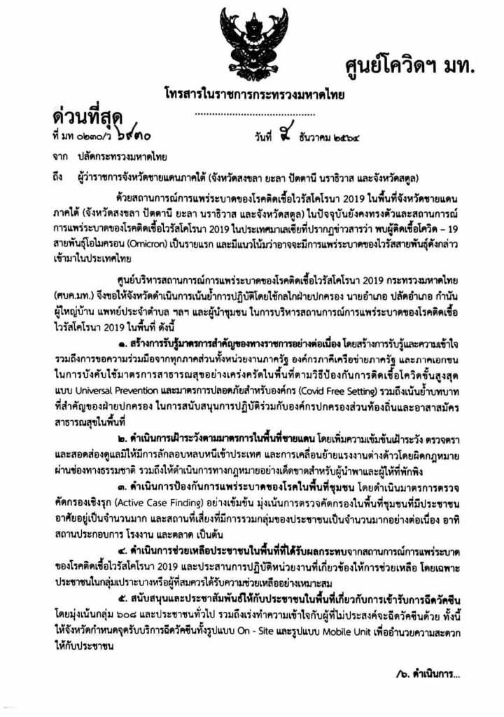 เมื่อวันที่ 6 ธันวาคม นายสุทธิพงษ์ จุลเจริญ ปลัดกระทรวงมหาดไทย ในฐานะหัวหน้าผู้รับผิดชอบในการแก้ไขสถานการณ์ฉุกเฉินในส่วนเกี่ยวกับการสั่งการและประสานกับผู้ว่าราชการจังหวัดและผู้ว่าราชการกรุงเทพมหานคร กล่าวว่า ขณะนี้สถานการณ์การแพร่ระบาดของโรคติดเชื้อไวรัสโคโรนา 2019 (โควิด-19) ในพื้นที่ 5 จังหวัดชายแดนภาคใต้ยังคงต้องเฝ้าระวัง และได้เกิดการแพร่ระบาดของเชื้อไวรัสโควิด-19 สายพันธุ์โอไมครอนเป็นรายแรกในประเทศมาเลเซีย และมีแนวโน้มอาจจะมีการแพร่ระบาดของไวรัสสายพันธุ์ดังกล่าวเข้ามายังประเทศไทย ตนจึงได้กำชับไปยังผู้ว่าราชการจังหวัดสงขลา ยะลา ปัตตานี นราธิวาส และสตูล เน้นย้ำการปฏิบัติโดยใช้กลไกฝ่ายปกครอง นายอำเภอ ปลัดอำเภอ กำนัน ผู้ใหญ่บ้าน แพทย์ประจำตำบล ฯลฯ และผู้นำชุมชน บริหารสถานการณ์การแพร่ระบาดของโรคโควิด-19 ตามแนวทางปฏิบัติ ได้แก่