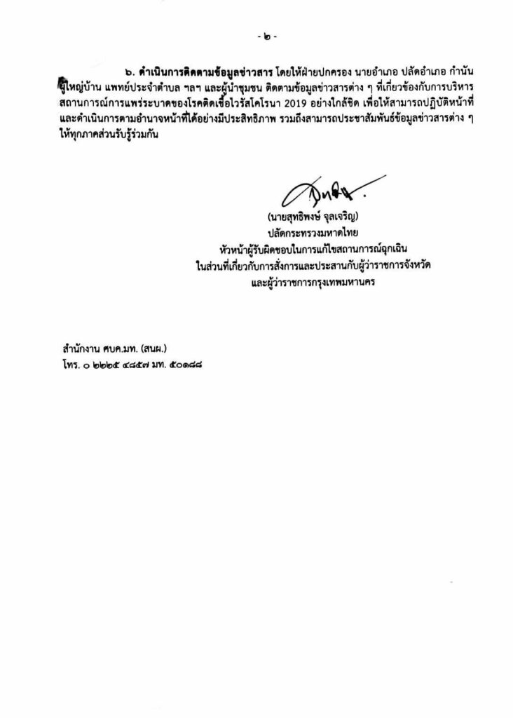 “ให้ฝ่ายปกครอง นายอำเภอ ปลัดอำเภอ กำนัน ผู้ใหญ่บ้าน แพทย์ประจำตำบล ฯลฯ และผู้นำชุมชน ติดตามข้อมูลข่าวสารต่าง ๆ ที่เกี่ยวข้องกับการบริหารสถานการณ์การแพร่ระบาดของโรคโควิด-19 อย่างใกล้ชิด เพื่อสามารถปฏิบัติหน้าที่และตามอำนาจหน้าที่ได้อย่างมีประสิทธิภาพ รวมถึงมีข้อมูลเพื่อสื่อสารสร้างความเข้าใจให้กับทุกภาคส่วนในพื้นที่ได้รับรู้ร่วมกัน” นายสุทธิพงษ์ กล่าว