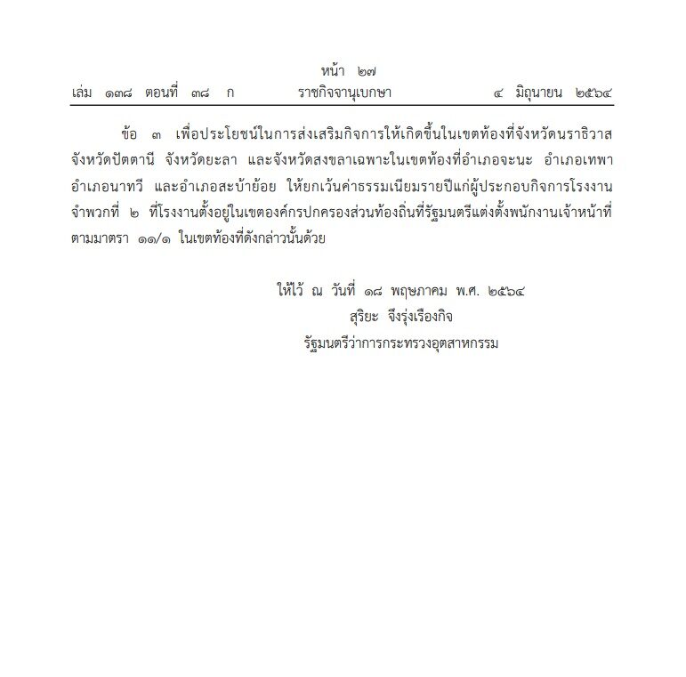 เมื่อวันที่ 4 มิถุนายน 2564 เว็บไซต์ราชกิจจานุเบกษา เผยแพร่ กฎกระทรวงยกเว้นค่าธรรมเนียมให้แก่ผู้ประกอบกิจการโรงงานซึ่งโรงงานตั้งอยู่ในเขตท้องที่จังหวัดนราธิวาส จังหวัดปัตตานี จังหวัดยะลา และ จังหวัดสงขลา เฉพาะในเขตท้องที่อำเภอจะนะ อำเภอเทพา อำเภอนาทวี และอำเภอสะบ้าย้อย พ.ศ. 2564