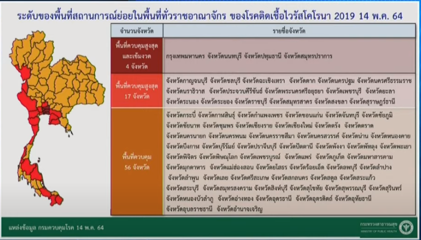 ล่าสุด นายแพทย์ทวีศิลป์ วิษณุโยธิน โฆษกศูนย์บริหารสถานการณ์ COVID-19 (ศบค.) เปิดเผยภายหลังแถลงสถานการณ์ ผู้ติดเชื้อโควิด-19 ถึงการปรับระดับพื้นที่ควบคุมทั่วราชอาณาจักรที่มีประกาศใช้เมื่อวันที่ 1 พฤษภาคม 2564 ที่ผ่านมา โดยมีการปรับเปลี่ยนดังต่อไปนี้