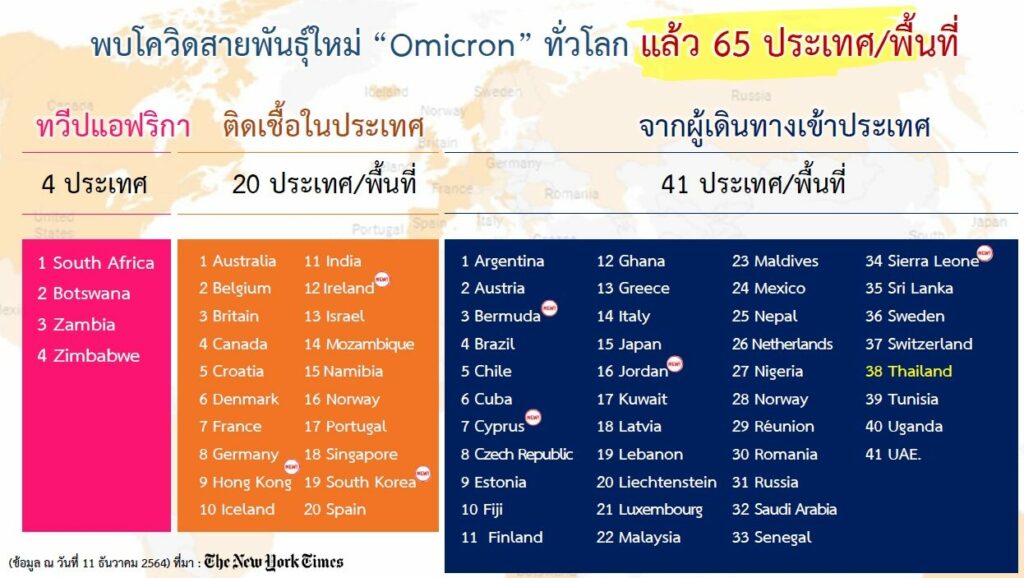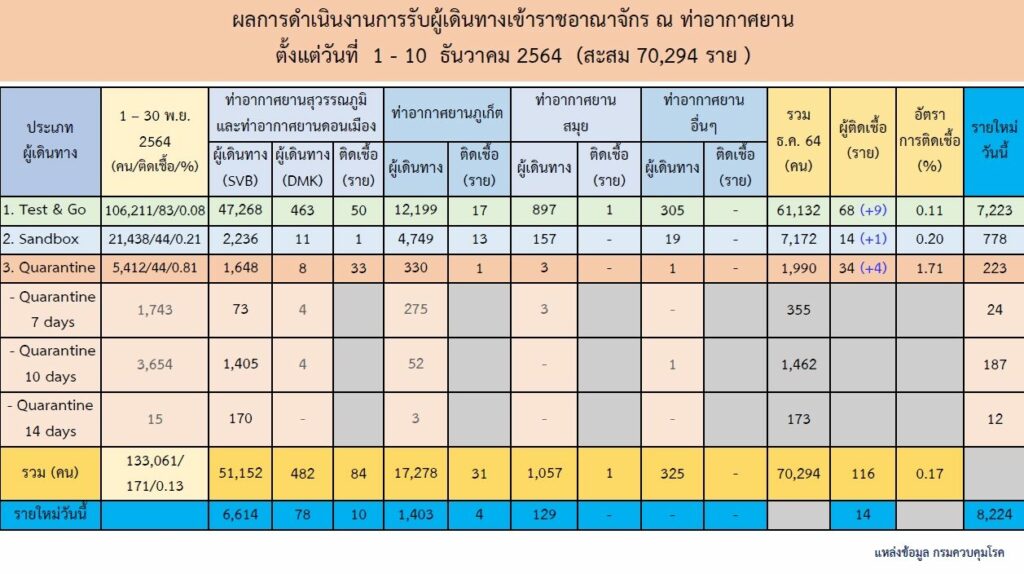 ทั้งนี้ ตั้งแต่วันที่ 1-10 ธันวาคม มีผู้เดินทางเข้าประเทศแล้ว 70,294 ราย สำหรับ โอไมครอน ทั่วโลกนั้น มีผู้ติดเชื้อแล้ว 65 ประเทศ มี เบอร์มิวดา, ไซปรัส และจอร์แดน ที่พบผู้ติดเชื้อเพิ่ม