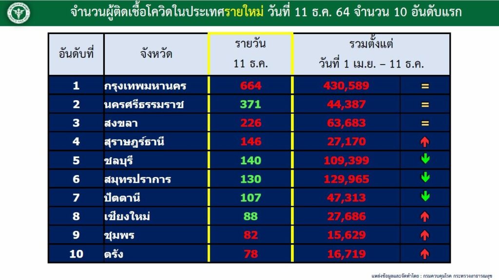 ส่วน 10 อันดับจังหวัดที่มีผู้ติดเชื้อในประเทศรายใหม่สูงสุด อันดับ 1 ยังคงเป็นกรุงเทพมหานคร 664 ราย สะสม 430,589 ราย อันดับ 2 นครศรีธรรมราช 371 ราย สะสม 44,387 ราย อันดับ 3 สงขลา 226 ราย สะสม 63,683 ราย อันดับ 4 สุราษฏร์ธานี 146 ราย สะสม 27,170 ราย อันดับ 5 ชลบุรี 140 ราย สะสม 109,399 ราย อันดับ 6 สมุทรปราการ 130 ราย สะสม 129,965 ราย อันดับ 7 ปัตตานี 107 ราย สะสม 47,313 ราย อันดับ 8 เชียงใหม่ 88 ราย สะสม 27,686 ราย อันดับ 9 ชุมพร 82 ราย สะสม 15,629 ราย และอันดับ 10 ตรัง 78 ราย สะสม 16,719 ราย