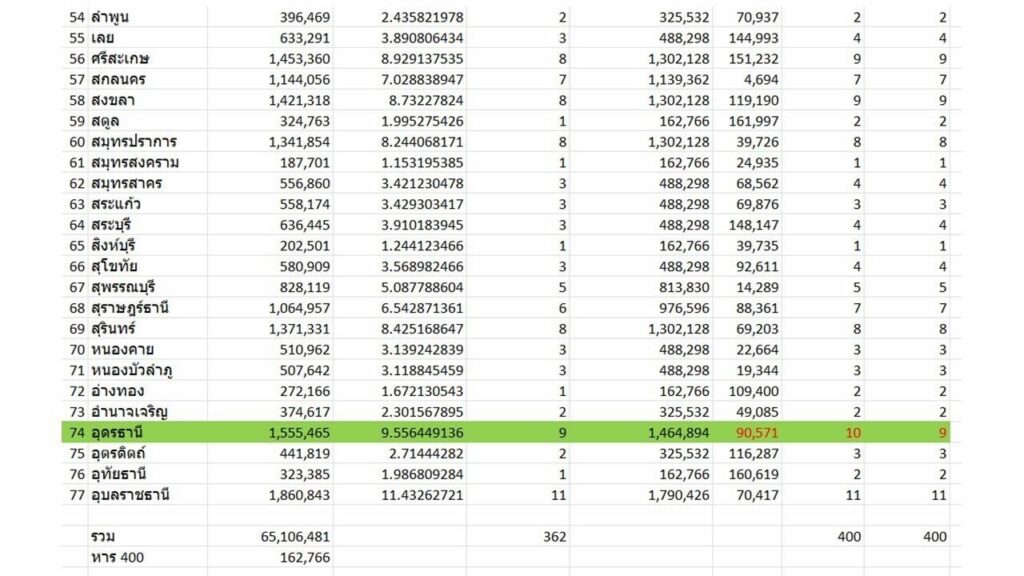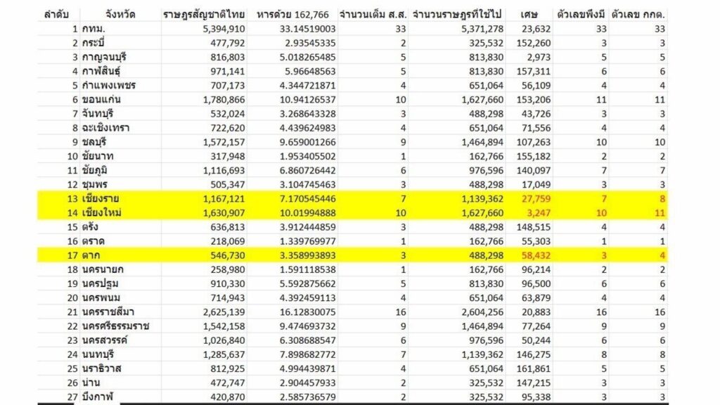 แปลว่า หากคำนวณโดยไม่นำคนไม่ได้สัญชาติไทยมารวม จังหวัดเชียงใหม่ เชียงราย และตาก ควรได้ ส.ส.น้อยลงจังหวัดละ 1 คน ในขณะที่ อุดรธานี ลพบุรี ปัตตานี ควรได้ ส.ส.เพิ่มอีกจังหวัดละ 1 คน
