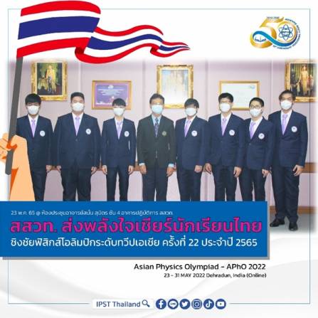 ดร.พรชัย อินทร์ฉาย รักษาการผู้อำนวยการสถาบันส่งเสริมการสอนวิทยาศาสตร์และเทคโนโลยี (สสวท.) เป็นประธานกล่าวในพิธีให้โอวาทและร่วมเป็นขวัญกำลังใจแก่คณะผู้แทนประเทศไทยเข้าร่วมการแข่งขันฟิสิกส์โอลิมปิกระดับทวีปเอเชีย ครั้งที่ 22 ประจำปี 2565 (Asian Physics Olympiad –APhO 2022) ผ่านระบบออนไลน์ ระหว่างวันที่ 23 – 31 พฤษภาคม 2565 ซึ่งมีประเทศอินเดีย เป็นเจ้าภาพ พร้อมด้วยนางสาวรัชดา ยาตรา ผู้ชํานาญ ปฏิบัติหน้าที่แทนผู้อํานวยการฝ่ายโอลิมปิกวิชาการและอัจฉริยภาพ คณะผู้แทนฯ คณาจารย์ผู้ควบคุมทีมก่อนเข้าร่วมการแข่งขัน ณ ห้องประชุมอาจารย์สนั่น สุมิตร ชั้น 4 อาคารปฏิบัติการ สสวท.