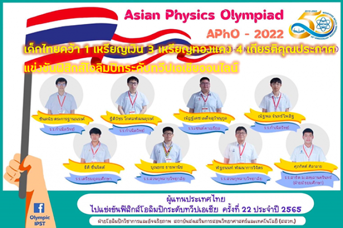 ดร.พรชัย อินทร์ฉาย รักษาการผู้อำนวยการ สถาบันส่งเสริมการสอนวิทยาศาสตร์และเทคโนโลยี (สสวท.) เปิดเผยว่า ตามที่ได้คัดเลือกและจัดส่งผู้แทนประเทศไทยเข้าร่วมการแข่งขันฟิสิกส์โอลิมปิกระดับทวีปเอเชีย ครั้งที่ 22 ประจำปี 2565 (Asian Physics Olympiad –APhO 2022) ผ่านระบบออนไลน์ ระหว่างวันที่ 23 – 31 พฤษภาคม 2565 ซึ่งมีสาธารณรัฐอินเดียเป็นเจ้าภาพ ผลปรากฏว่าผู้แทนประเทศไทยสามารถทำได้ 1 เหรียญเงิน 3 เหรียญทองแดง 4 เกียรติคุณประกาศ ดังนี้