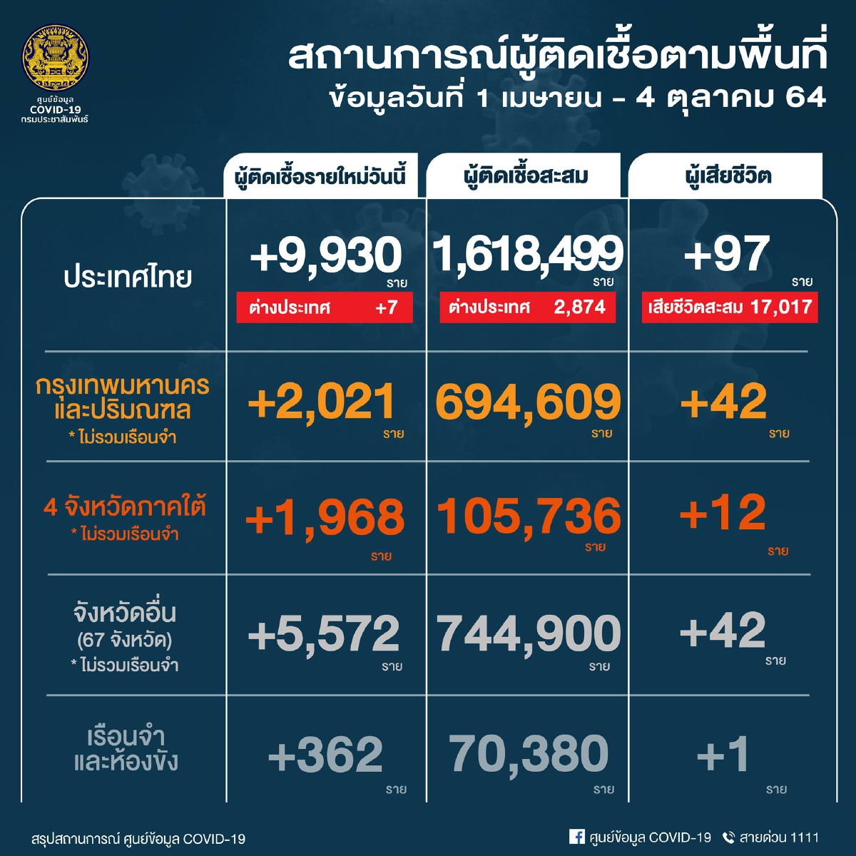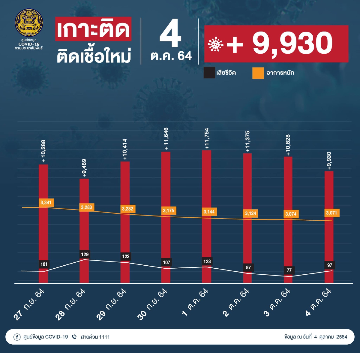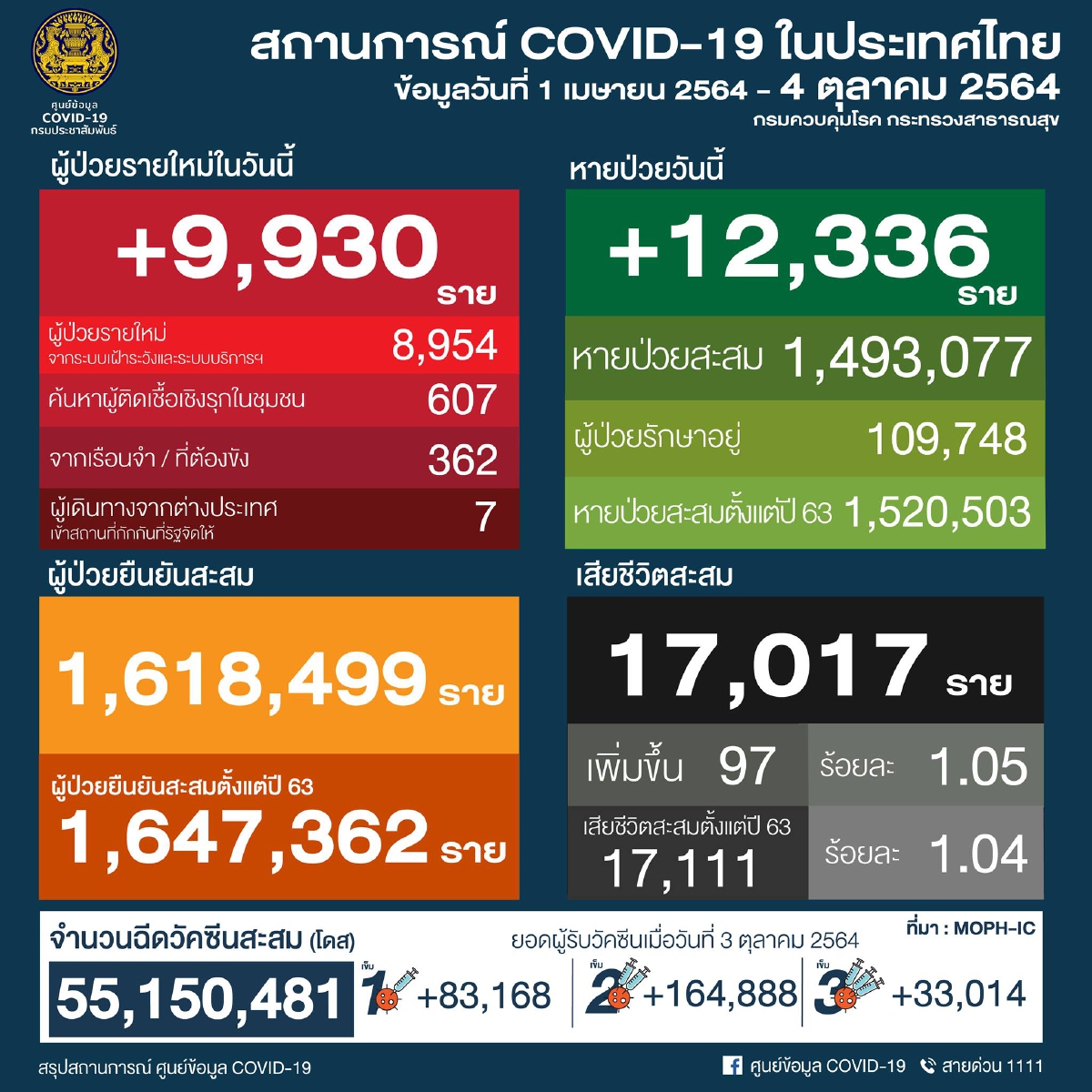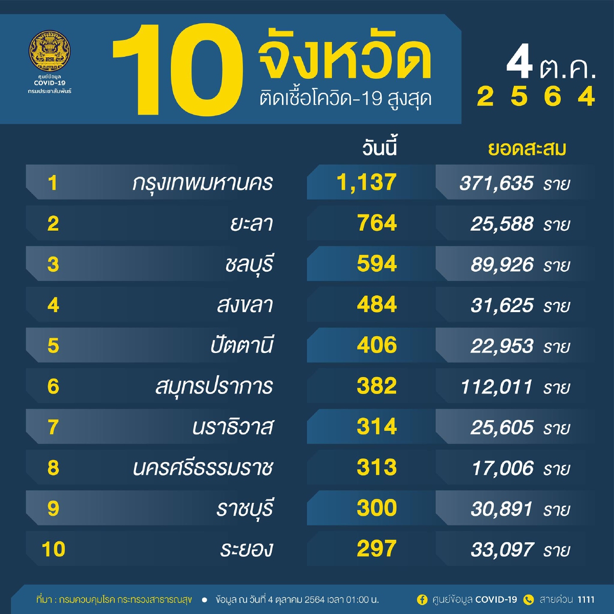 จํานวนผู้ติดเชื้อโควิดในประเทศรายใหม่ วันที่ 4 ตุลาคม 2564 ตรวจสอบ 10 จังหวัดอันดับแรก