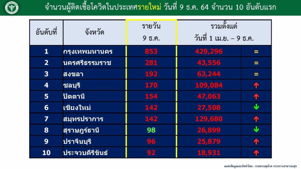 สำหรับ 10 จังหวัดติดเชื้อใหม่สูงสุด ได้แก่ กรุงเทพฯ 853 ราย สะสม 429,296 ราย นครศรีธรรมราช 281 ราย สะสม 43,556 ราย สงขลา 192 ราย สะสม 63,244 ราย ชลบุรี 170 ราย สะสม 109,084 ราย ปัตตานี 154 ราย สะสม 47,063 ราย เชียงใหม่ 142 ราย สะสม 27,508 ราย สมุทรปราการ 142 ราย สะสม 129,680 ราย สุราษฎร์ธานี 98 ราย สะสม 26,899 ราย ปราจีนบุรี 96 ราย สะสม 25,879 ราย ประจวบคีรีขันธ์ 92 ราย สะสม 18,931 ราย