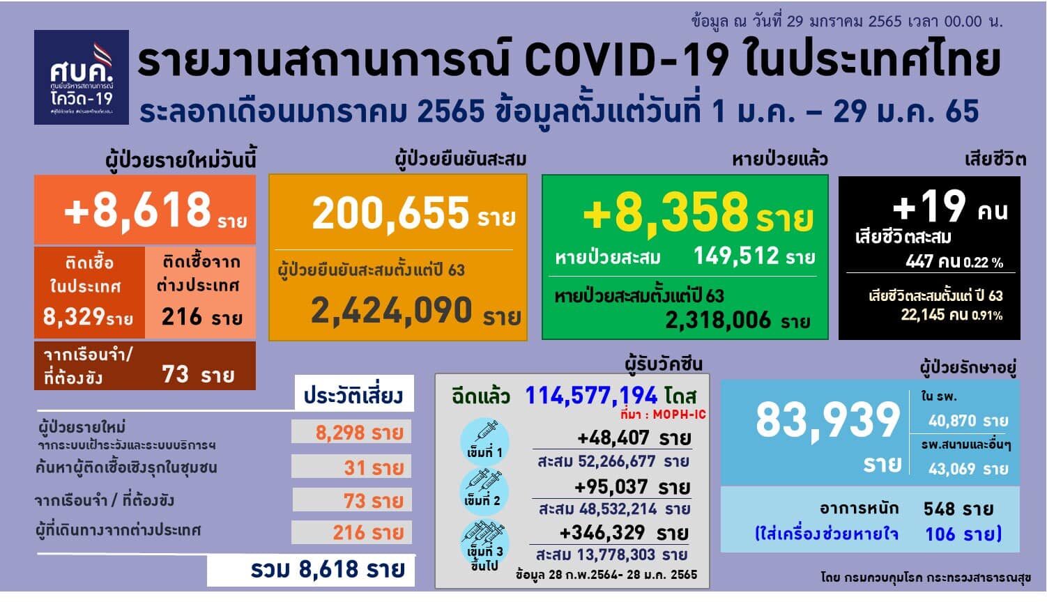 วันที่ 29 ม.ค.65 ศูนย์บริหารสถานการณ์โควิด 19 (ศบค.) รายงานสถานการณ์โควิด 19 ประจำวันว่า วันนี้ประเทศไทยมีผู้ติดเชื้อใหม่ 8,618 ราย สะสม 2,424,090 ราย หายป่วย 8,358 ราย สะสม 2,318,006 ราย เสียชีวิต 19 ราย สะสม 22,145 ราย อยู่ระหว่างการรักษา 83,939 ราย มีอาการหนัก 548 ราย และใส่เครื่องช่วยหายใจ 106 ราย