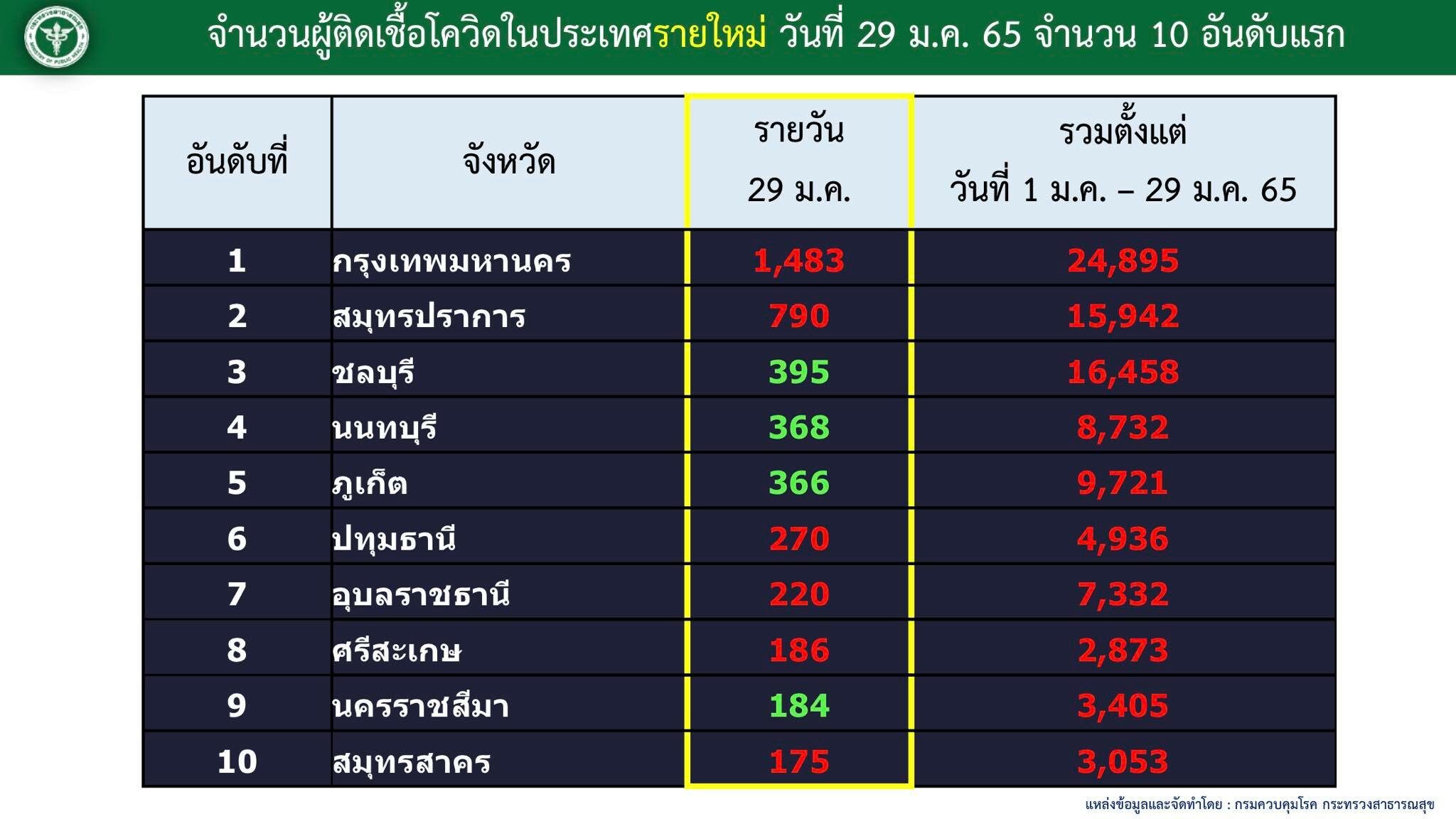 ส่วน 10 จังหวัดที่ติดเชื้อสูงสุด ได้แก่ 1.กทม. 1,483 ราย 2.สมุทรปราการ 790 ราย 3.ชลบุรี 395 ราย 4.นนทบุรี 368 ราย 5.ภูเก็ต 366 ราย 6.ปทุมธานี 270 ราย 7.อุบลราชธานี 220 ราย 8.ศรีสะเกษ 186 ราย 9.นครราชสีมา 184 ราย และ 10.สมุทรสาคร 175 ราย