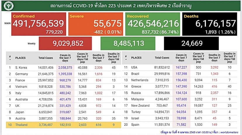 เมื่อวันที่ 4 เมษายน ผู้สื่อข่าวรายงานว่า ศูนย์บริหารสถานการณ์การแพร่ระบาดของโรคติดเชื้อไวรัสโคโรนา 2019 (โควิด-19) (ศบค.) รายงานสถานการณ์การติดเชื้อโควิด-19 ทั่วโลก พบว่า มีผู้ติดเชื้อโควิด-19 ทั่วโลกสะสม จำนวน 491,756,539 ราย รักษาหายแล้วรวม จำนวน 426,546,216 ราย และเสียชีวิตรวม 6,176,157 ราย โดยประเทศที่มีจำนวนผู้ติดเชื้อสูงที่สุด 5 อันดับ ได้แก่ เกาหลีใต้ เยอรมนี ฝรั่งเศส เวียดนาม และ อิตาลี ส่วน ประเทศไทย อยู่ในอันดับที่ 10 ของโลก