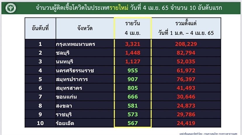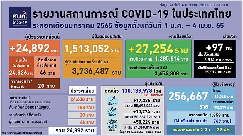 4 เม.ย.65 ไทยพบผู้ติดเชื้อโควิด 24,892 ราย มากเป็นอันดับ 10 ของโลก คร่าอีก 97 ชีวิต